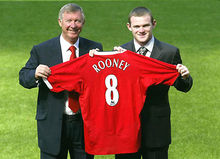 联官方正式宣布成功购入埃弗顿锋线鲁尼,转会费最高将达到2700万英镑,而鲁尼与曼联签下了一份直到2010年6月30日的为期6年的合约,周薪约在5万英镑左右。2004-2005赛季,鲁尼加盟曼联后,因为欧洲杯时的脚伤一直处在修养状态。直到2004年9月28日,鲁尼在曼联对阵费内巴切的欧冠小组赛中首次代表曼联出场,而他在曼联的处子秀就上演帽子戏法,帮助曼联6-2大胜对手,这场比赛让鲁尼成为欧冠历史上上演“帽子戏法”最年轻的球员。2004年10月24日,在曼联对阵阿森纳的英超联赛中,鲁尼贡献了一次助攻和一粒进球,帮助曼联2-0击败阿森纳,同时终结了对手49场不败的纪录。鲁尼在曼联的首个赛季里各项比赛打进17球,并在赛季结束时当选PFA年度最佳年轻球员。2005-2006赛季,在英格兰联盟杯的比赛中,曼联一路闯入决赛,而鲁尼在决赛中打进两粒进球,帮助曼联4-0击败威根竞技,鲁尼获得自己职业生涯中的第一个冠军。2006年4月30日,在曼联和切尔西的英超联赛中,鲁尼被切尔西队的后卫保罗·费雷拉侵犯,导致跖骨骨折,最终导致曼联0-3负于切尔西,让切尔西提前2轮成功卫冕英超联赛冠军。而鲁尼在整个赛季共出场48次,贡献了19粒进球,并且在赛季末蝉联PFA年度最佳年轻球员。2006-2007赛季,在季前热身赛中,鲁尼在对阵波尔图的比赛中因为肘击对方球员科佩勒·费雷拉被裁判红牌罚下。但荷当值主裁判去函英足总要求对鲁尼追加处罚,英足总随后宣布鲁尼停赛三场,成为了世界足坛罕有的因为热身赛而得到追加处罚的案例。2006年8月20日,鲁尼在英超联赛首轮表现抢眼,攻入两粒进球而且贡献出两次助攻,帮助曼联5-1大胜富勒姆。2006年10月28日,刚过完21岁生日的鲁尼在曼联对博尔顿的比赛中上演帽子戏法,结束自己长达十场不进球的进球荒。
